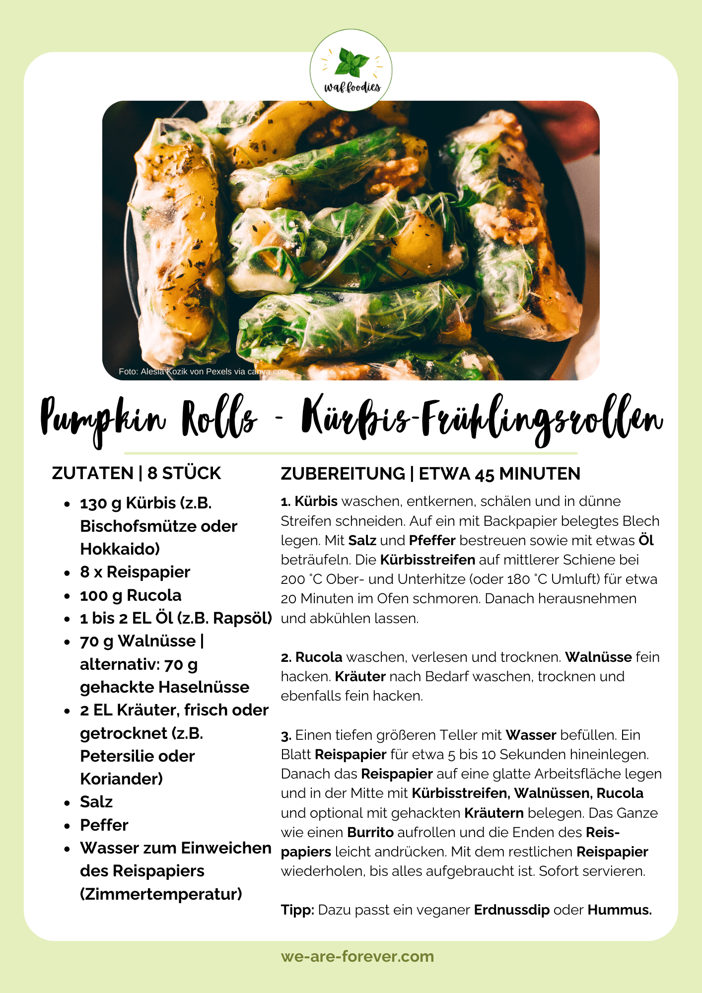 ✅ Rezeptkarte für vegane Frühlingsrollen mit Kürbis